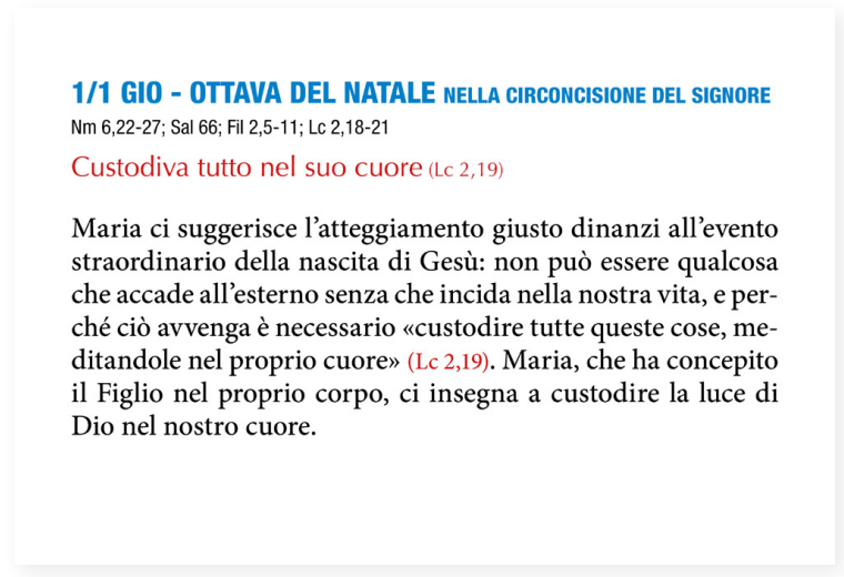 Sul retro di ogni pagina si trovano brevi meditazioni ispirate alle letture del giorno.