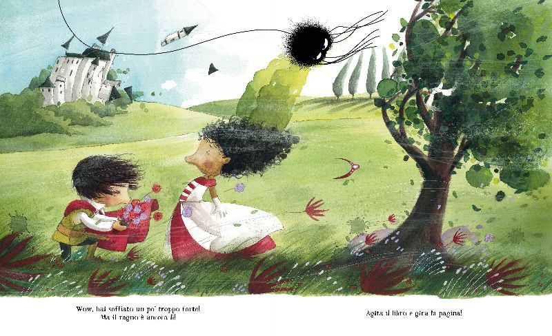un ragnetto si intromette fra le pagine, disturbando e al contempo ravvivando la lettura… e allora il baby lettore lo dovrà mandar via, agitando il libro, non alzando troppo la voce, soffiando, inclinando le pagine… dovrà insomma compiere un sacco di missioni, altrimenti il racconto non si concluderà e il cavaliere e la principessa non si incontreranno mai!